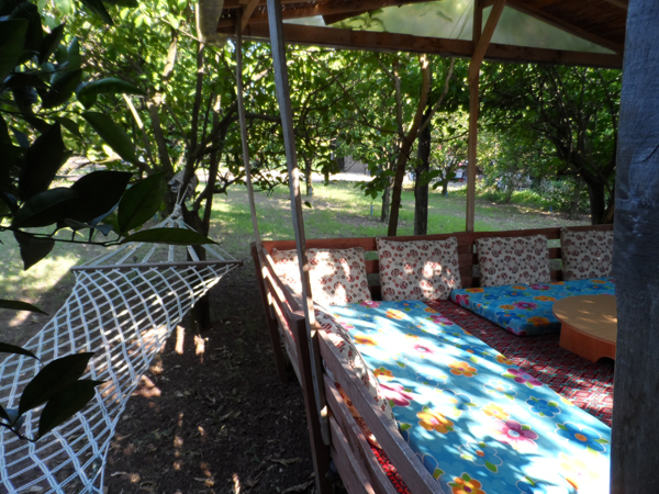Our rooms are located in fruit trees. In the living area, couches, hammocks, sun loungers are offered to our valued guests.